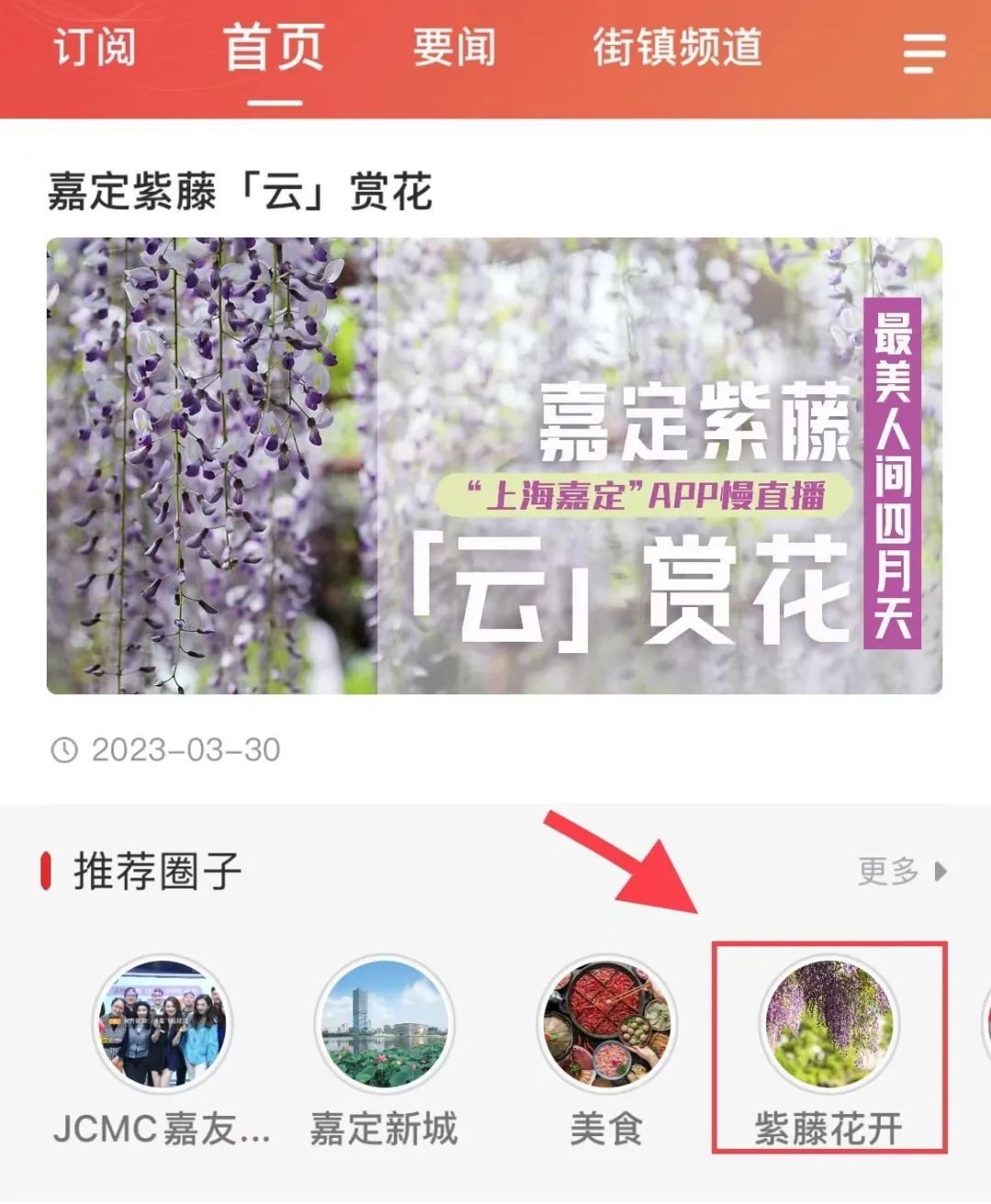 在首页点击圈子【紫藤花开】