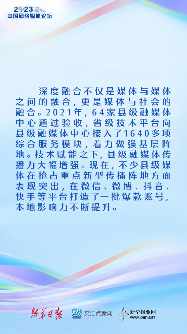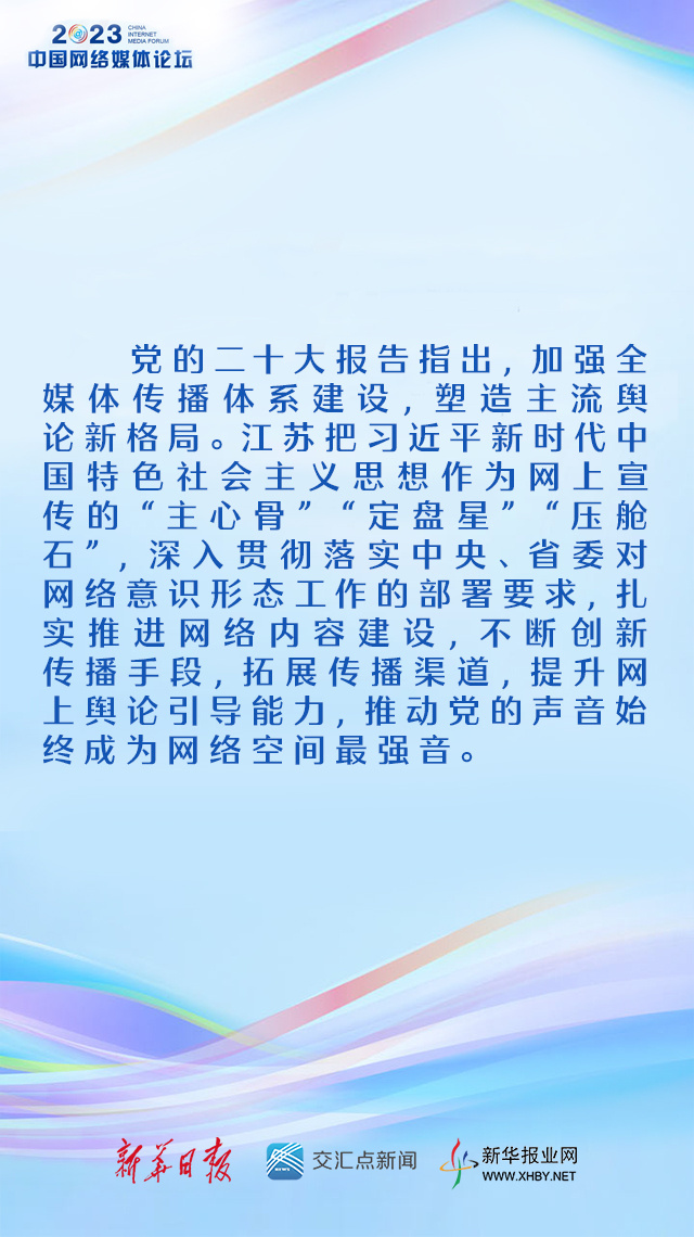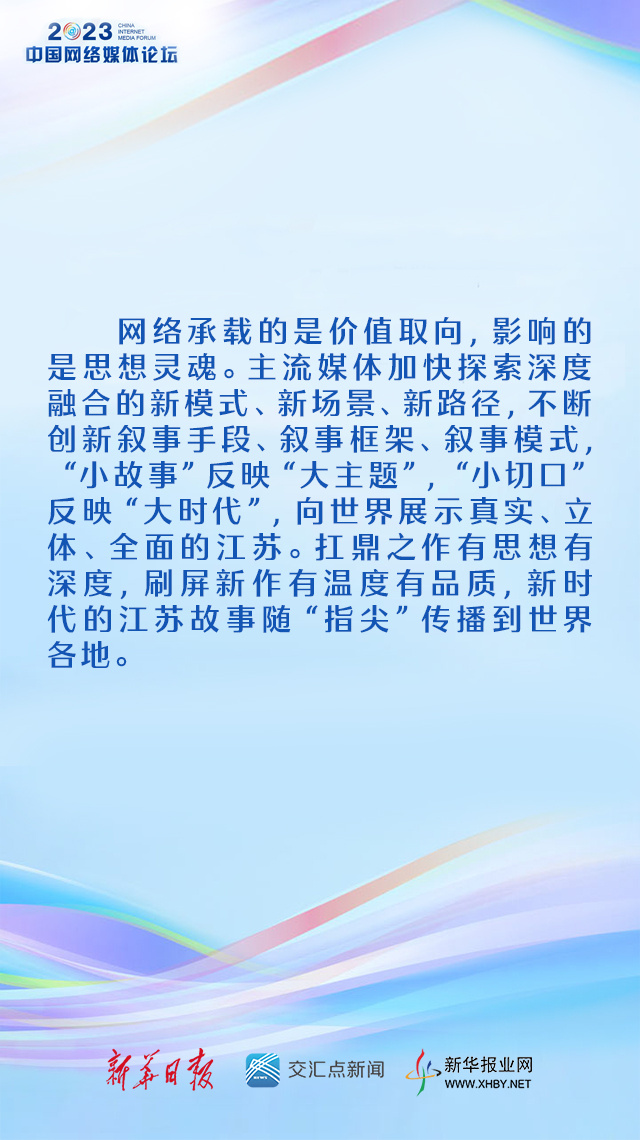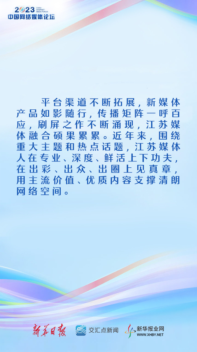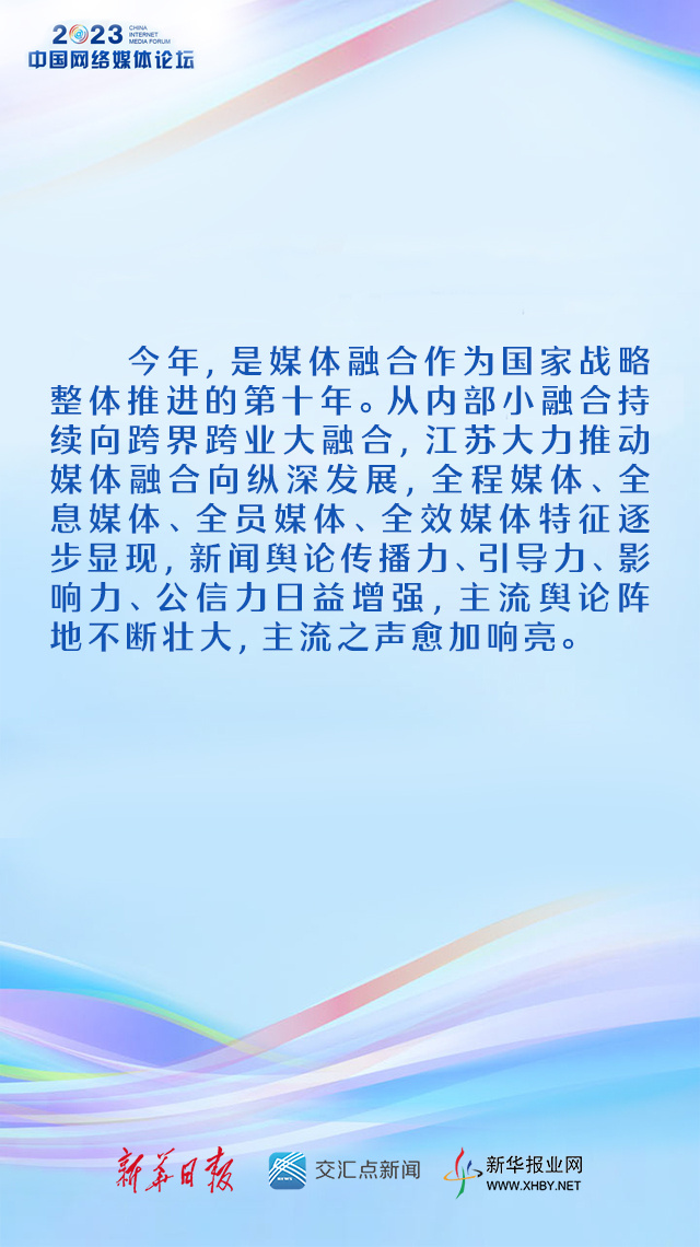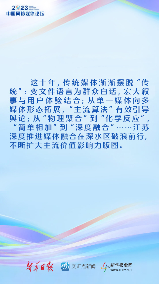 4月21日至22日,2023中国网络媒体论坛在江苏南京举行。今年是媒体融合作为国家战略整体推进的第十年。十年来,江苏媒体积极投身媒体融合发展,主流之声愈加响亮,主流价值可感可触,不断书写媒体融合发展的“江苏答卷”!