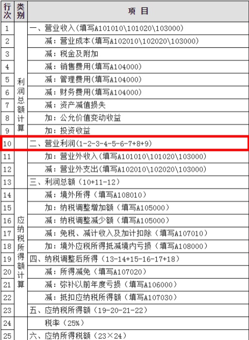 填写在A100000 《中华人民共和国企业所得税年度纳税申报表(A类)》中。本部分未设“其他收益”项目,对于已执行《财政部关于修订印发2018年度一般企业财务报表格式的通知》(财会〔2018〕15号)的纳税人,在《利润表》中归集的“其他收益”项目则无需填报,同时第10行“二、营业利润”按照《利润表》“营业利润”项目直接填报,不执行“第10行=第1-2-3-4-5-6-7+8+9行”的表内关系。
