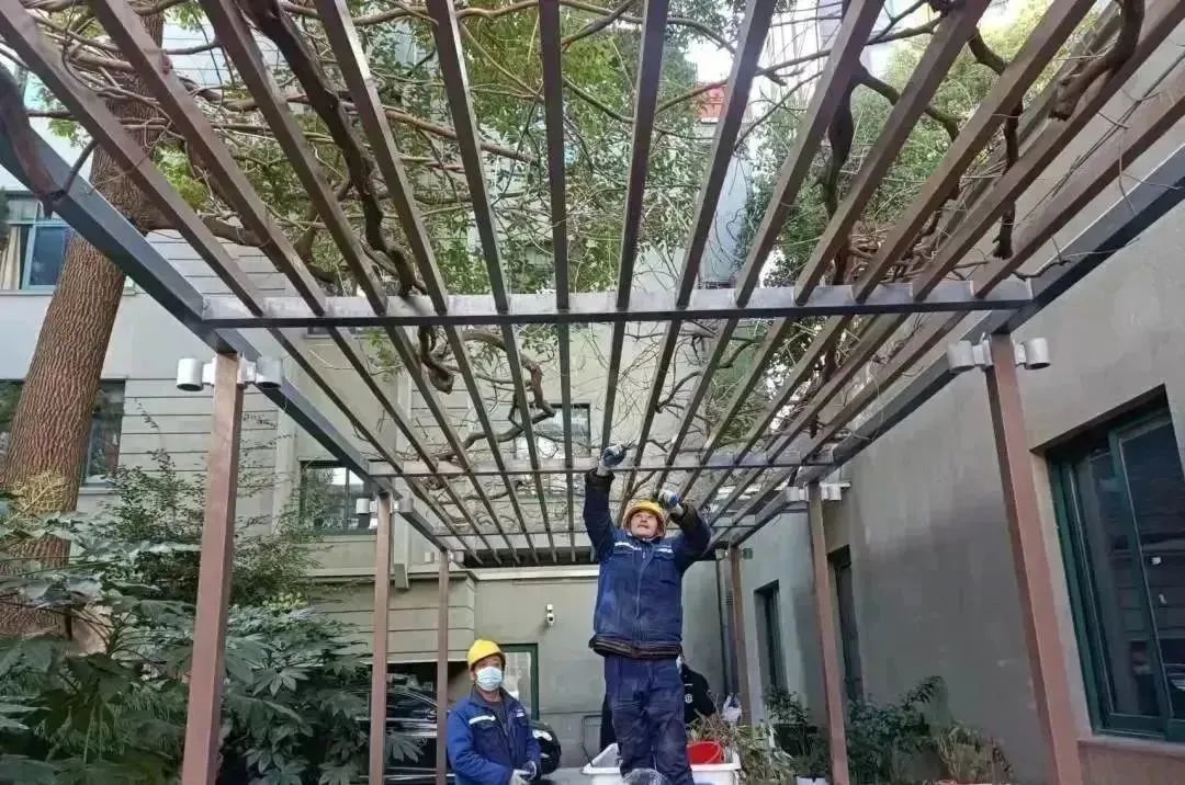古树编号0899的紫藤(二级古树,树龄100年) 目前长状态良好,2022年,区绿化市容局联合岳阳医院,对其进行了修剪、施肥、并对锈蚀的棚架进行更换,改善了古树的生长环境。