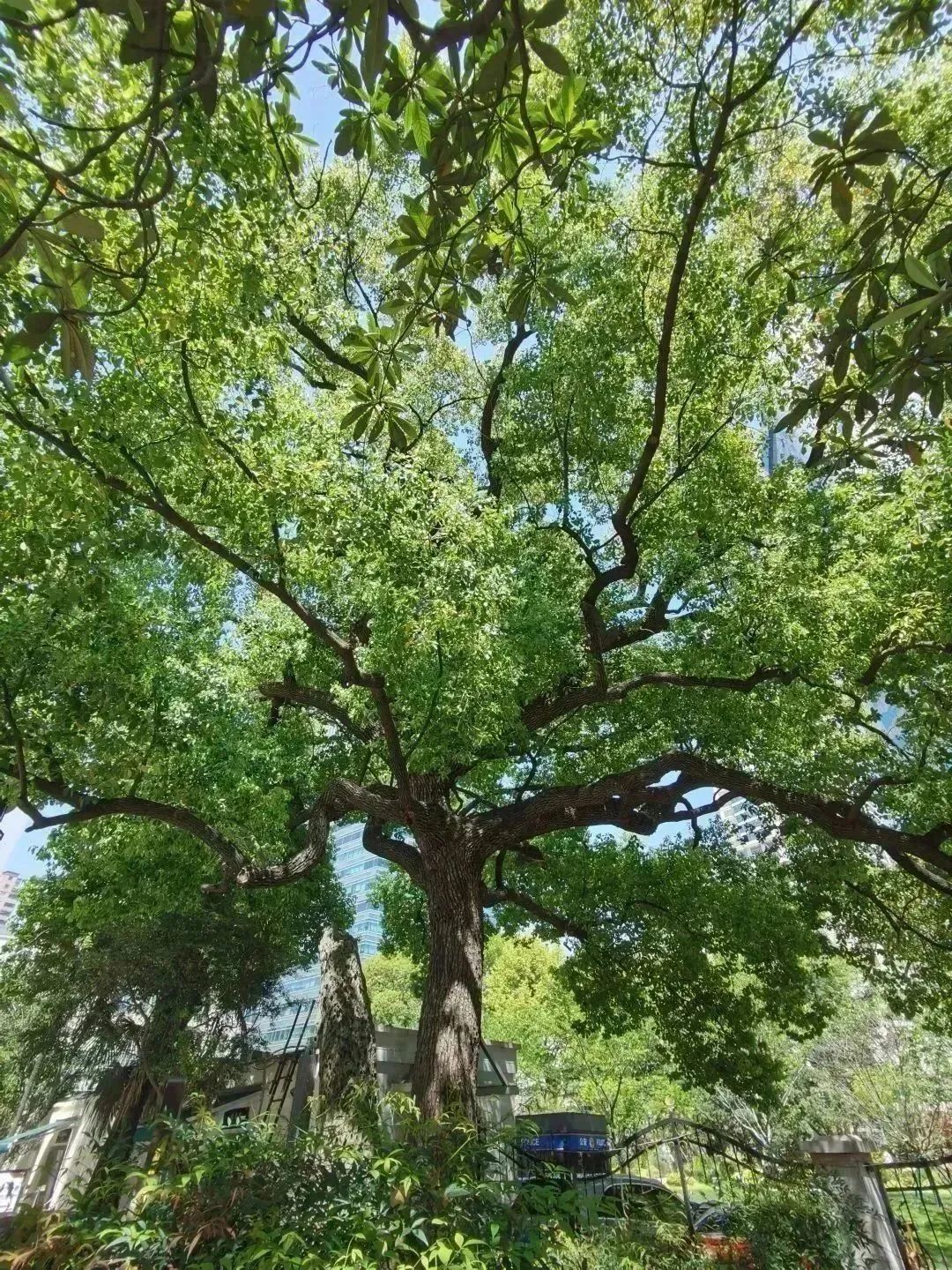 古树编号1603的香樟(二级古树,树龄100年)是目前静安区冠径最大的古树,树冠完整呈现,近乎圆形,树干笔直粗壮,枝繁叶茂,犹如一顶绿色的巨伞。