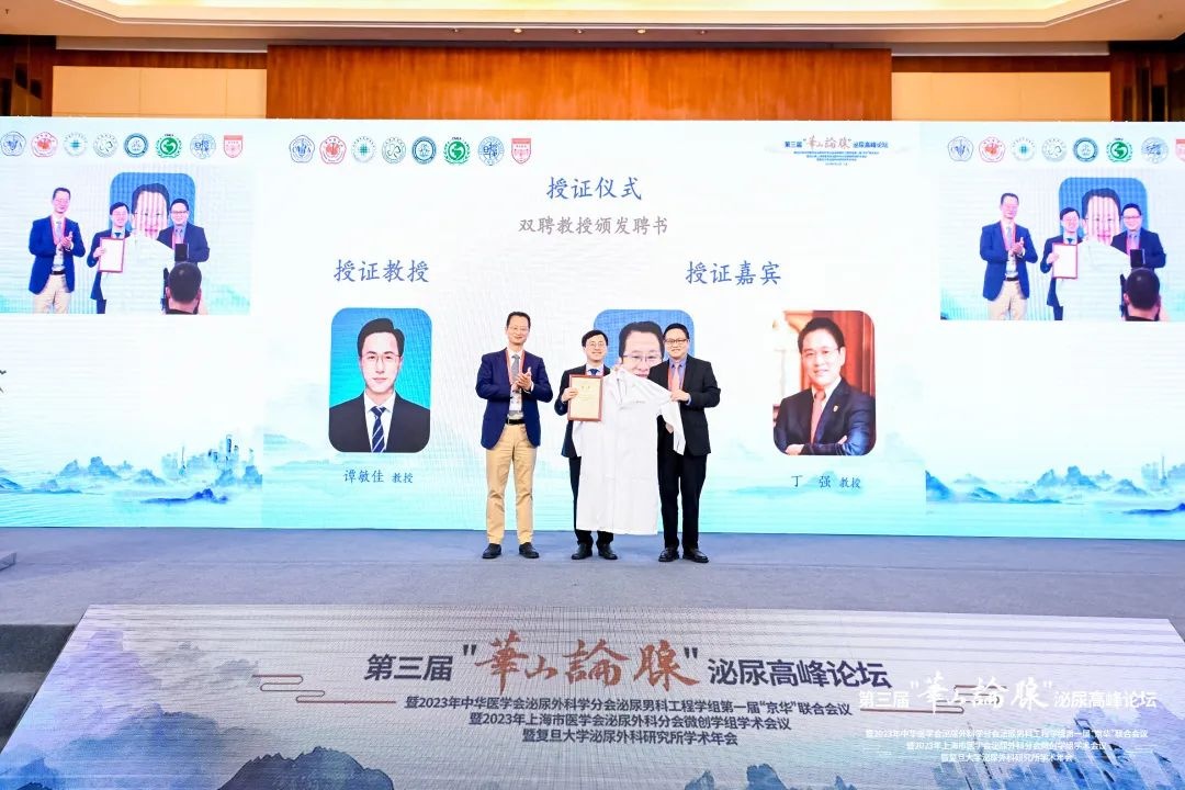 随后,姜昊文教授介绍了复旦大学泌尿外科研究所新任双聘教授,国家杰出青年基金、科技部创新领军人才、中国青年科技奖获得者、中国科学院上海药物所的谭敏佳教授,并由马昕教授、丁强教授上台为谭敏佳教授举行授证仪式。