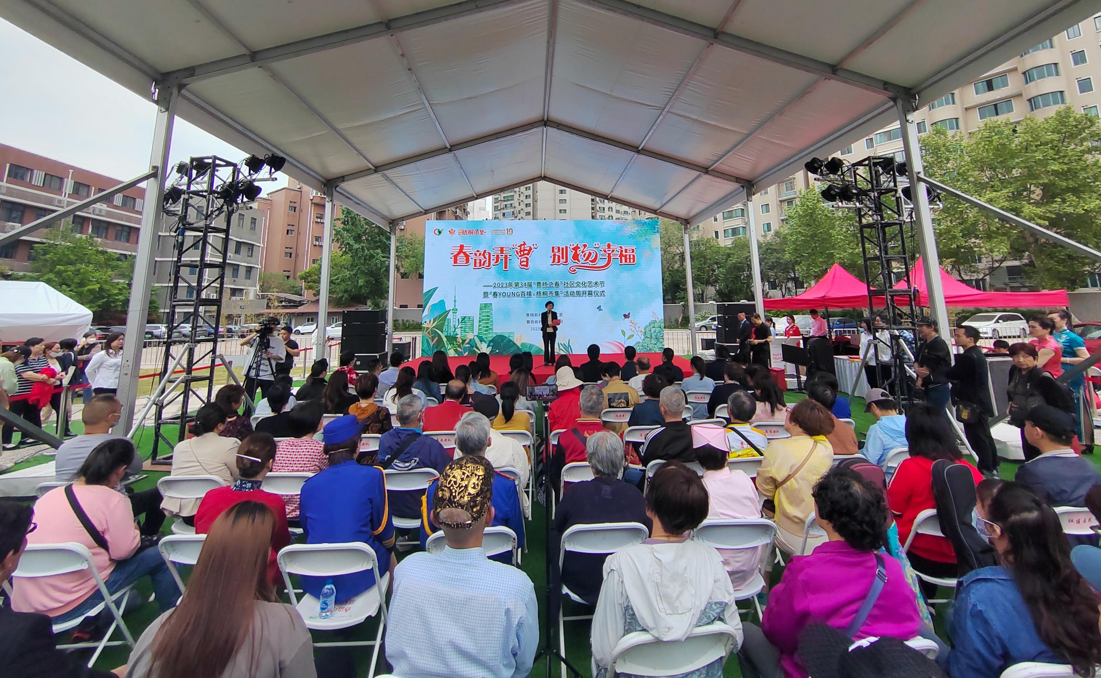 4月19日下午,“春韵弄‘曹’ 别‘杨’幸福”第34届“曹杨之春”社区文化艺术节暨2023年“春YOUNG百禧梧桐市集”活动周在百禧公园正式开启。