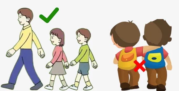 行——在行走中,躯体移动应正直、平稳,两手臂自然下垂,摆动协调,膝盖正对前方,脚尖略微向外侧,两脚后跟几乎在一条直线上,两腿交替前移的弯曲程度不要太大,步伐稳健均匀。学生的书包应使用双肩的书包,使脊柱两边受理均衡,不易造成脊柱侧弯。两人同行时,手不要相互搭在肩背上。