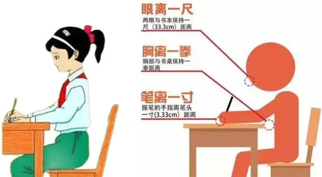 坐——坐椅子时,要坐满整个椅面,才可保持良好的姿势。学生听课时坐姿应保持挺胸收腹,下肢要摆放规矩端正,不要摆得太开太大;书写时要注意“一拳、一尺、一寸”。另外,给中小学生配置合适的桌椅,才能使学生保持良好的坐势。