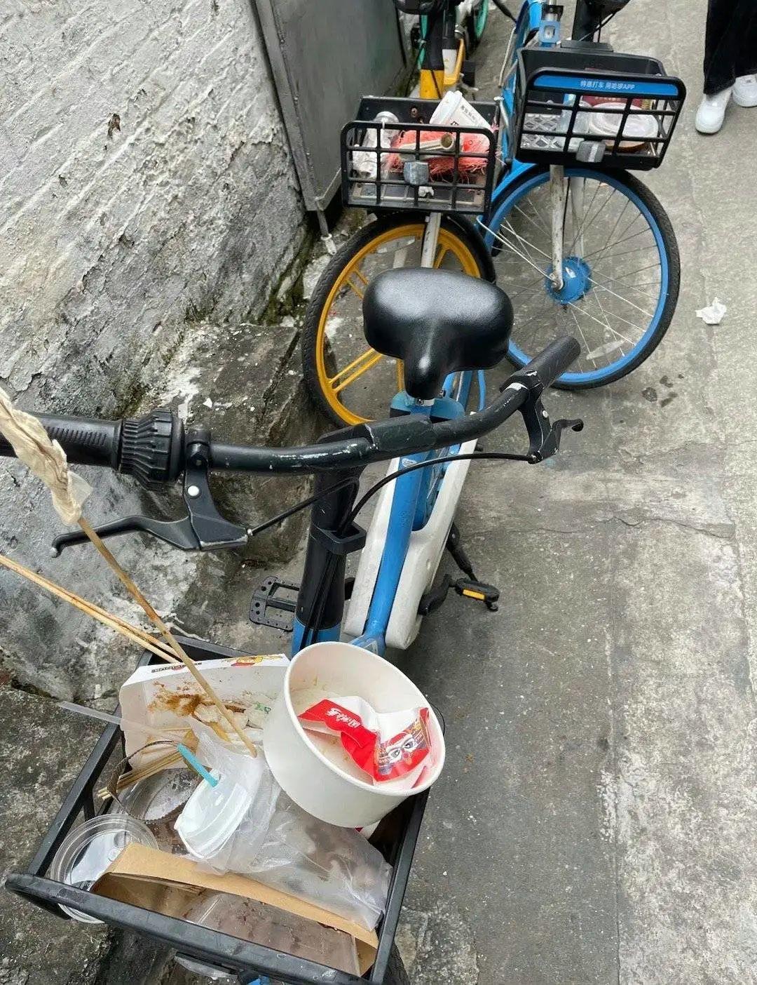更有网友调侃,许多垃圾都丢在了路边的共享单车车筐里。(乱丢垃圾是不好的,请大家不要模仿以下行为)