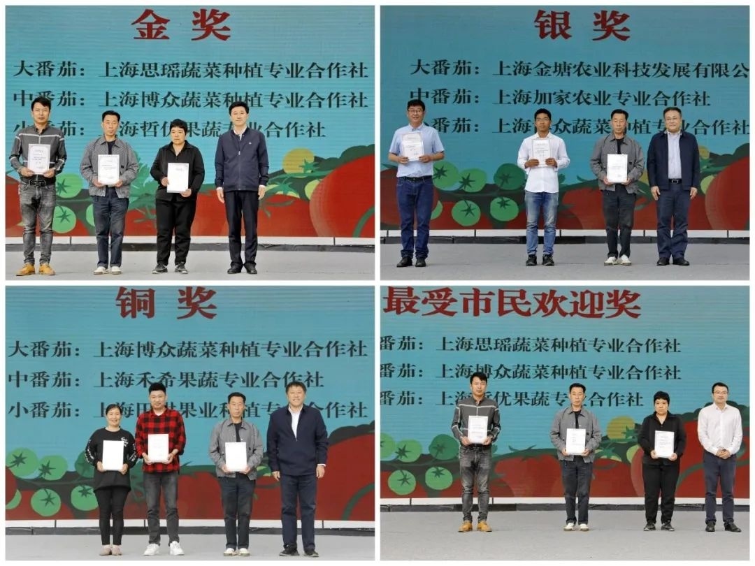 此外,上海博众蔬菜种植专业合作社、上海灵茂蔬果种植专业合作社、上海思瑶蔬菜种植专业合作社、上海哲优果蔬专业合作社等4家基地获得上海市地产优质番茄(小果型)最受市民欢迎奖;上海博众蔬菜种植专业合作社、上海禾希果蔬专业合作社、上海思瑶蔬菜种植专业合作社、上海哲优果蔬专业合作社、上海枫泾九丰农业科技有限公司等5家基地获得上海市番茄优秀生产基地。
