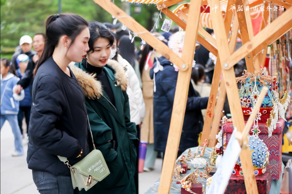 国风市集上,还设置了传统文化体验区,部分山东乡村好青年、青年非遗传承人、青年手艺人在现场开设华服展示、非遗手造、特色文创等摊位,吸引了大批市民、游客、国风爱好者驻足体验投壶、捶丸、击鼓传花等传统游戏,学习金石传拓、中华甲胄、皮影木雕、章丘木版年画、济南面塑、古琴斫制、手工印染、缠丝缠花、非遗绒花、砂陶烧造、绳结艺术、团扇、十二龙九凤冠等传统文化艺术,沉浸式、体验式感受中华文化底蕴,领略齐鲁文化风采。