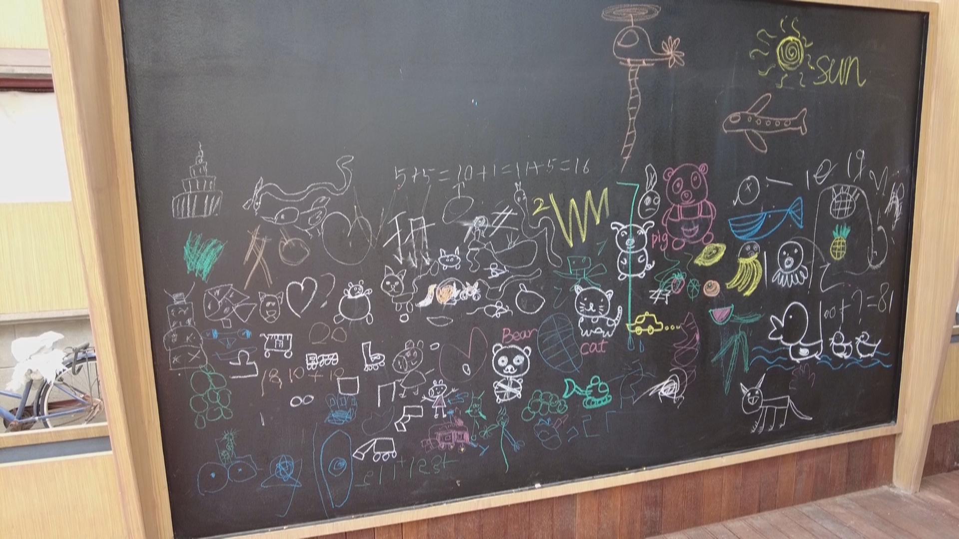 儿童乐园里,有滑滑梯、跳房子、涂鸦板。