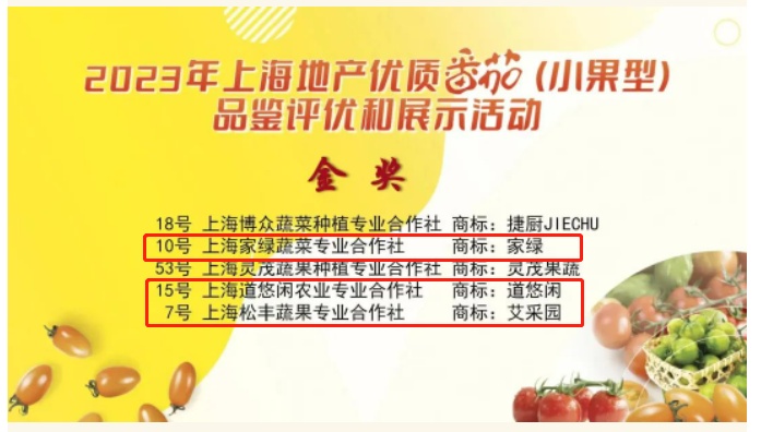 值得一提的是,家绿合作社不仅在本场品鉴评优活动中拔得头筹,还在两天前的2023年上海地产优质番茄(小果型)品鉴评优中斩获“金奖”“市民欢迎奖”以及 “上海地产番茄优秀生产基地”荣誉称号,实现了奖项全覆盖。