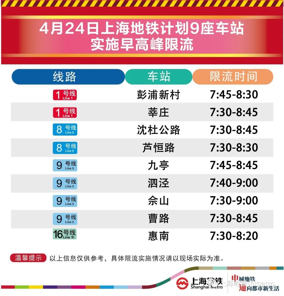 4月24日,上海地铁早高峰限流措施将继续实施,届时将有9座地铁站早高峰计划限流。