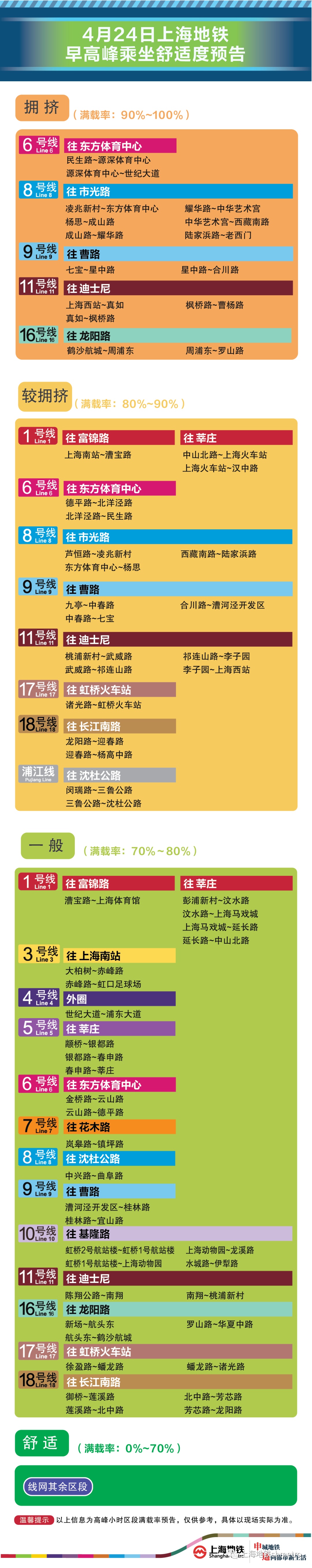 为提升上海地铁早高峰期间出行服务水平,提升乘客乘坐体验,上海地铁向乘客提供乘坐舒适度预告,方便乘客提前做好出行准备。