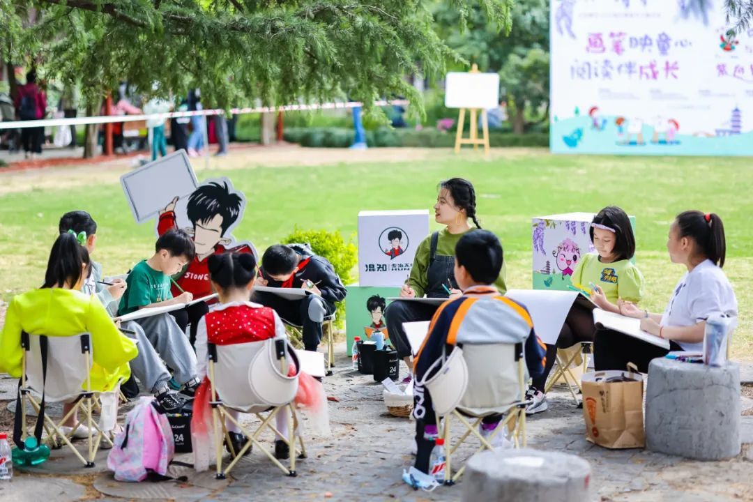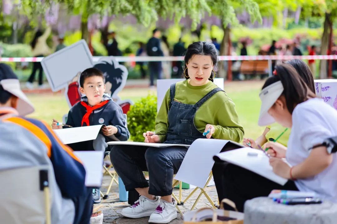 下午1点半,嘉定紫藤园响起悠扬的小提琴声,拉开了一场浪漫的紫色约“绘”。在“混子哥”主创团队的带领下,8个小画家把“混知”“藤宝”两种不同风格的IP融于绘画中,将美景定格在画纸上。
