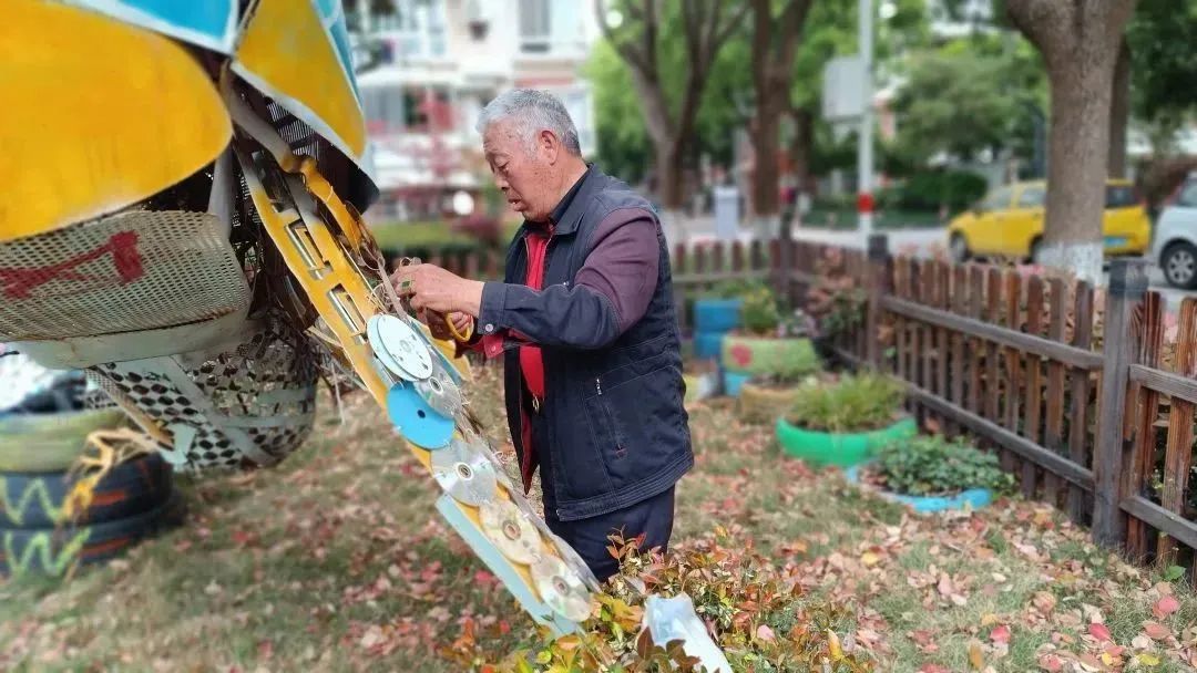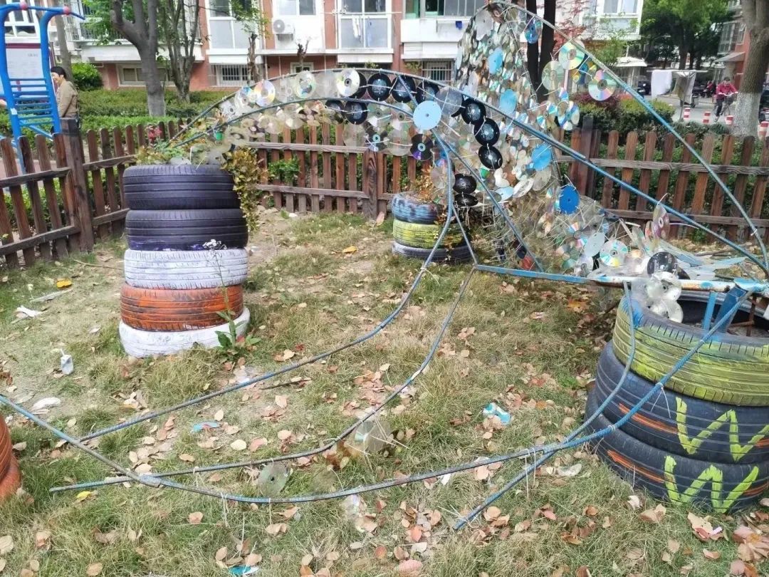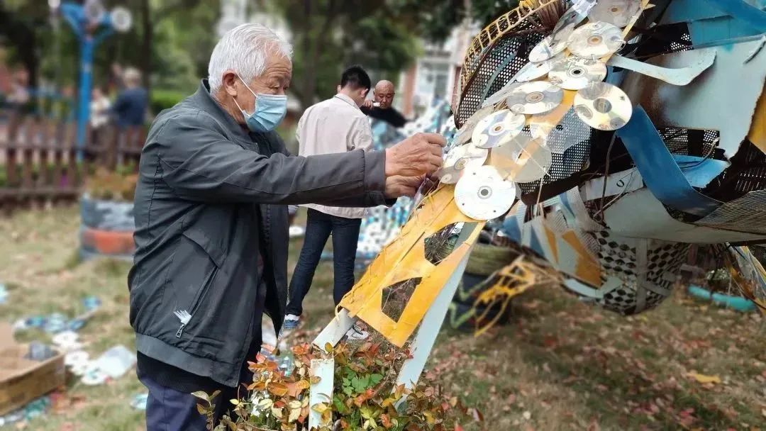 志愿者们各自分工齐心动手,利用废旧物品,一点点的把破损的“水之灵”造型鱼修补完善,把“星星花园”重新打理。