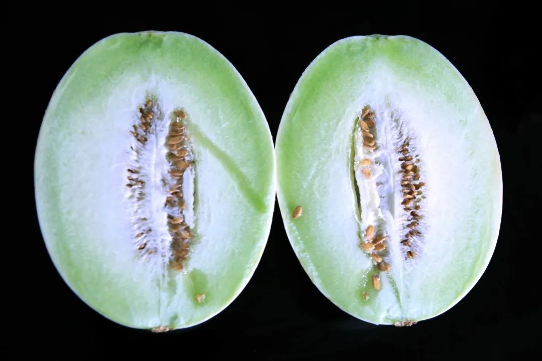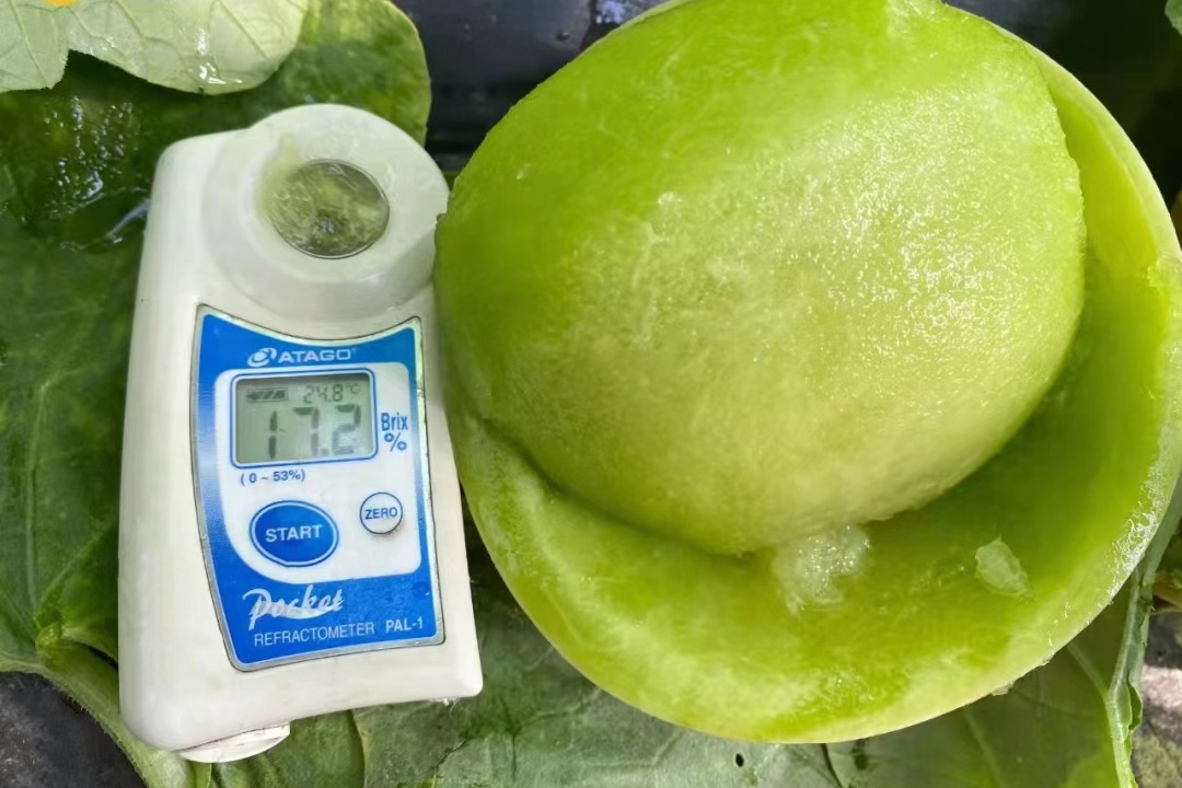 “玉菇”甜瓜又称“白皮绿肉瓜”,成熟的甜瓜表皮呈奶白色并带有细细的绒毛。有别于其它脆瓜,其口感如同冰淇淋一般柔嫩细腻、软糯多汁,深受市场喜爱。随手切开一个,甜度达到17.2度。