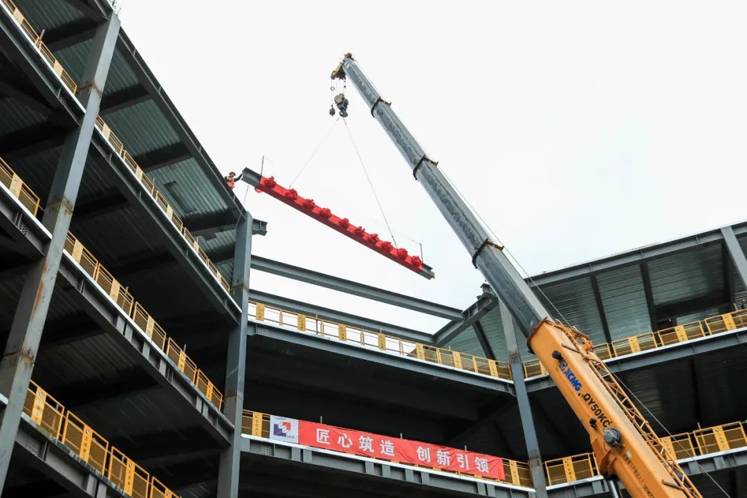 今天上午,160项目沿街新建建筑的最后一根钢梁在工程塔吊的牵引下缓缓升起,逐步放置到位,并完成固定安装。这根钢梁的安装到位,标志着上海老市府大楼终于实现了百年围合。
