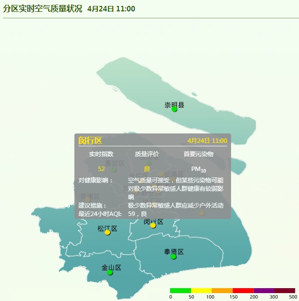 4月24日11时,闵行区AQI为54,良。24小时AQI为59,良。据上海市环境监测中心预报,今天下午优-良,夜间优-良,明天良,后天良。