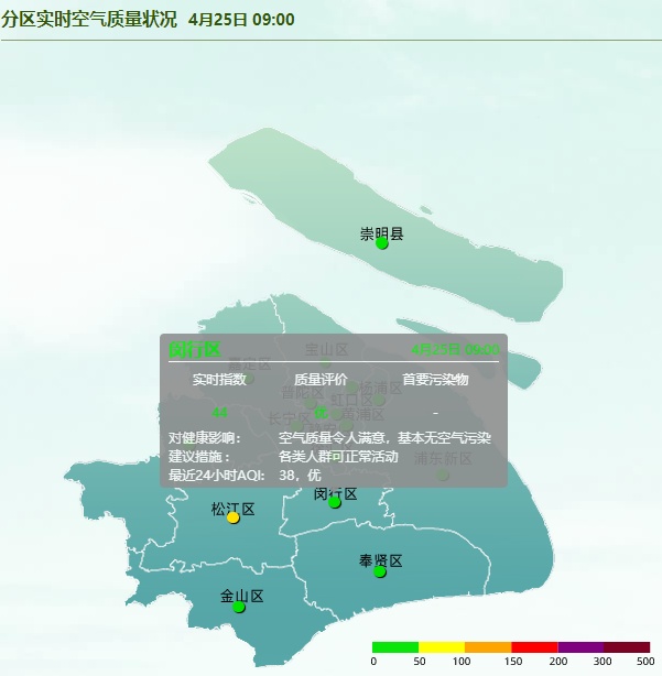 4月25日9时,闵行区AQI为44,优。24小时AQI为38,优。据上海市环境监测中心预报,今天下午优-良,夜间良,明天良,后天良。