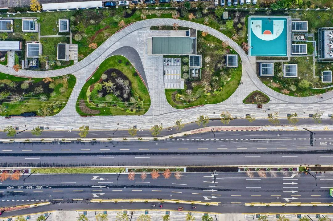 轨交14号线的铜川路站1号出入口设在该座口袋公园内,绿化空间不仅要吸纳来往进出的人流,还需承担10余处大大小小的通风井、冷却井等配套构筑物。既要从功能上留出人流集散的广场空间和非机动车停放区域,还要在景观上遮挡各类通风井等地铁附属设施。为此,沿着场地南北向理出一条曲线型主园路,在避开各类构筑物单体的同时,牵出3条支路,并与地铁站前广场有机融合,从而构成了整座园子的园路脉络。