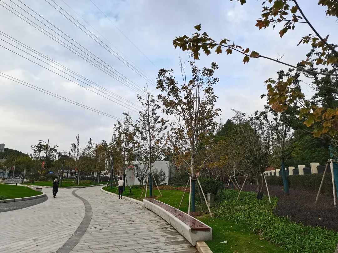 呼应大渡河路中分带呈线性布置的林冠线风貌,该座口袋公园主园路两侧种植同样品种的红花槭“十月光辉”,提供了近距离步行游赏红花槭秋季色彩的沉浸式体验,与之匹配的是丛生朴树、丛生乌桕等秋色叶树种,自2022年秋季已初具色叶规模。