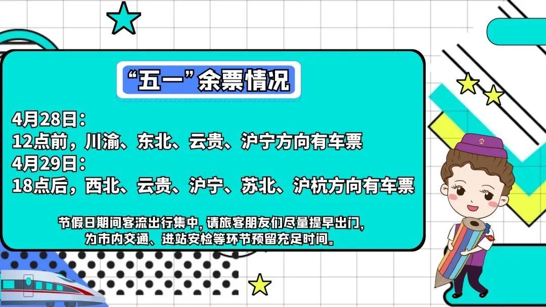 铁路上海站介绍,“五一”小长假即将来临,预计4月28日、4月29日和4月30日客流将高度集中,5月3日起将迎来返程客流高峰。4月29日当天预计发送旅客将达到65万人次,或创车站发送量历史新高。为尽力满足旅客出行需求,在启用高峰线的基础上,计划增开列车96列。详见↓