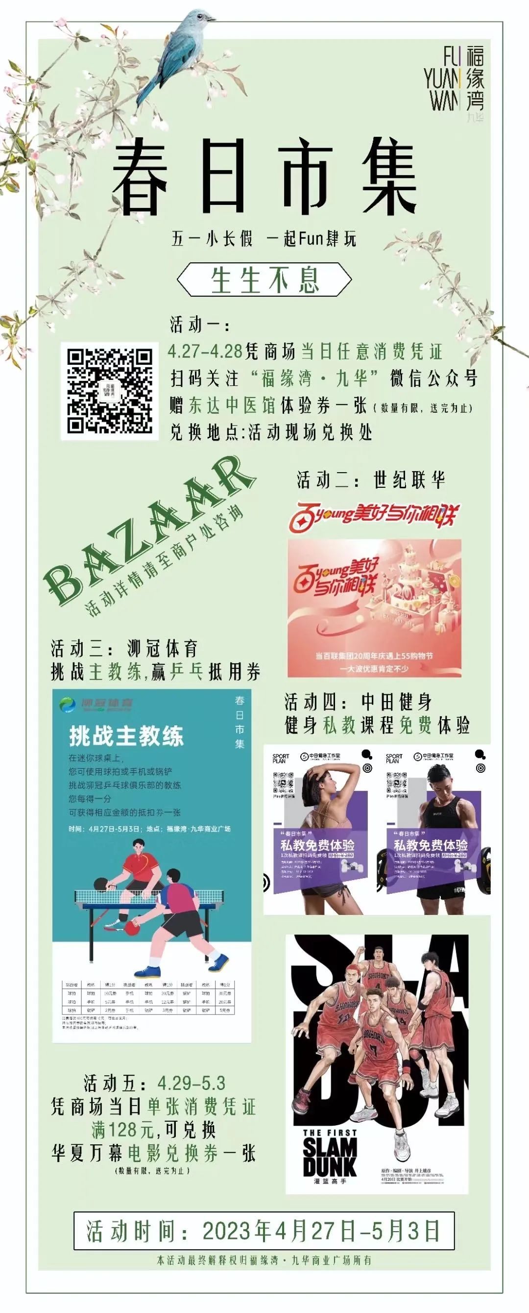位于长宁西区的福缘湾·九华商业广场,即将开启“春日市集”“五一”活动,快来开启你的“一站式”休闲度假模式吧~