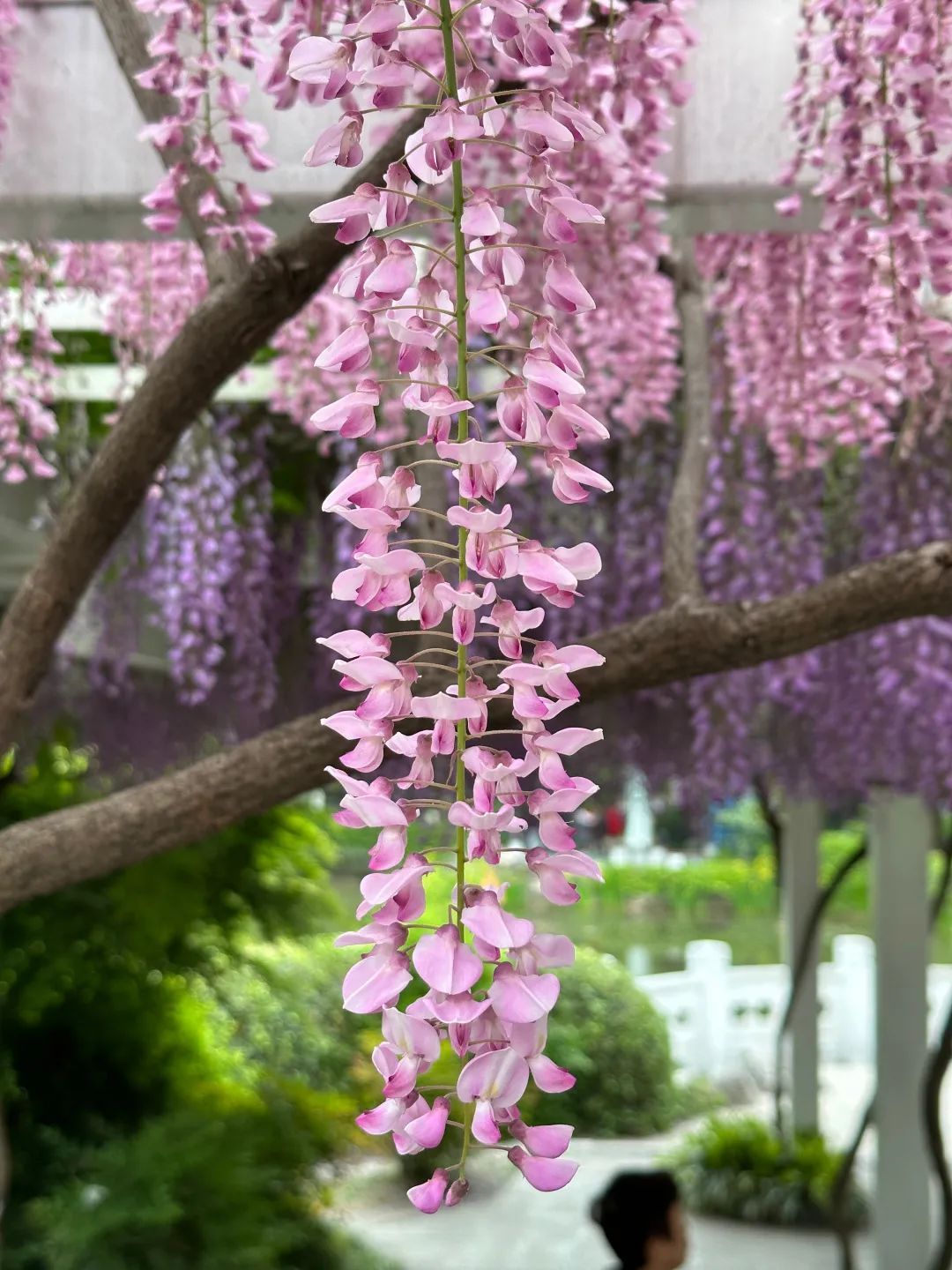 紫藤(豆科紫藤属),是优良的观花藤本植物,花序大而下垂,常常攀附于廊架、拱门,极具观赏性。清涧公园种植日本紫藤48株,品种包括开东阁、长崎一岁藤、口红藤、本红藤等多个品种。