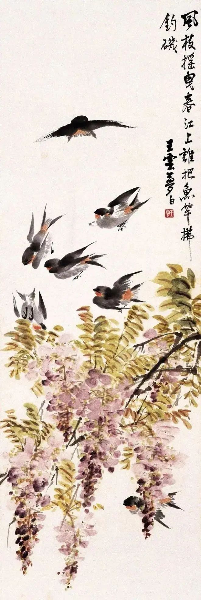 李白诗中写道: “紫藤挂云木,花蔓宜阳春。密叶隐歌鸟,香风留美人。”关于紫藤的绘画作品数不胜数,顺着垂摆的走势画出花叶相连,条蔓交错,常以花青、曙红、藤黄、胭脂、酞青蓝着色,密密匝匝,形如瀑布。