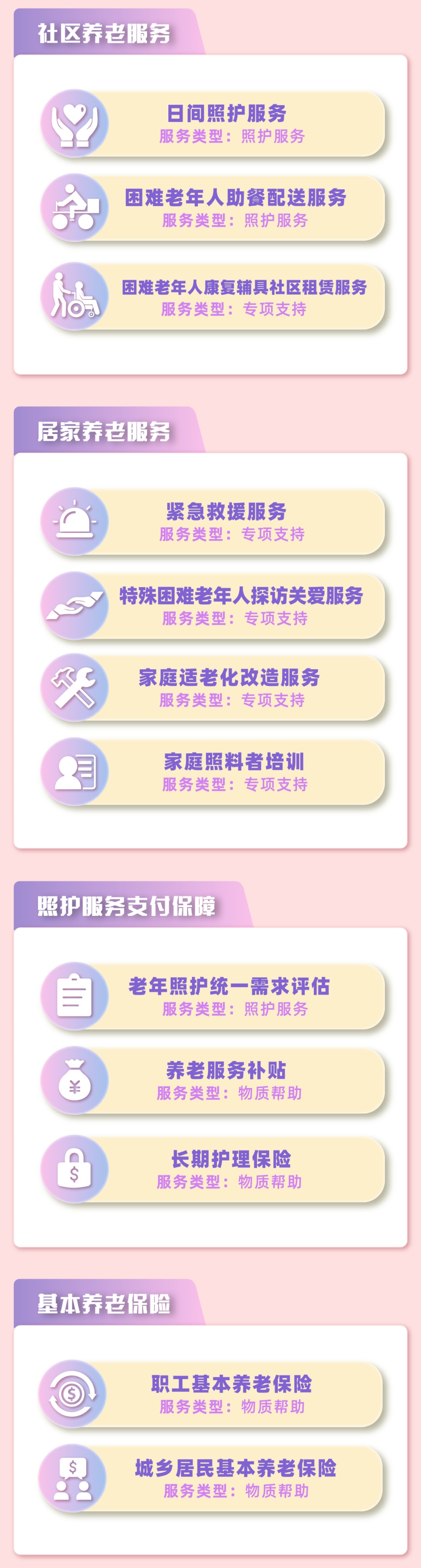 市民政局介绍,基本养老服务是指由国家直接提供或者通过一定方式支持相关主体向老年人提供的,旨在实现老有所养、老有所依必需的基础性、普惠性、兜底性服务。