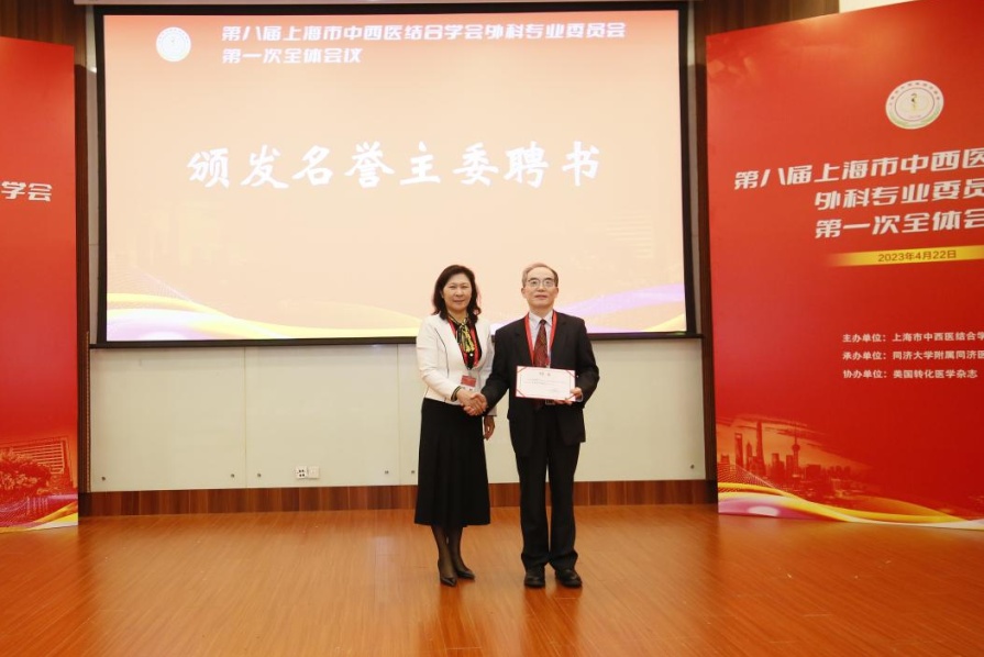 最后,上海市中西医结合学会副会长、上海市医事团体联合管理发展中心副主任顾璇教授为第八届上海中西医结合学会外科专业委员会主任委员、副主任委员、名誉主委以及顾问颁发证书。