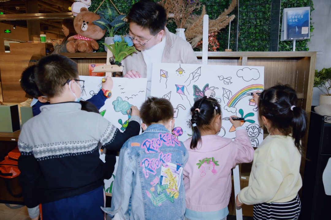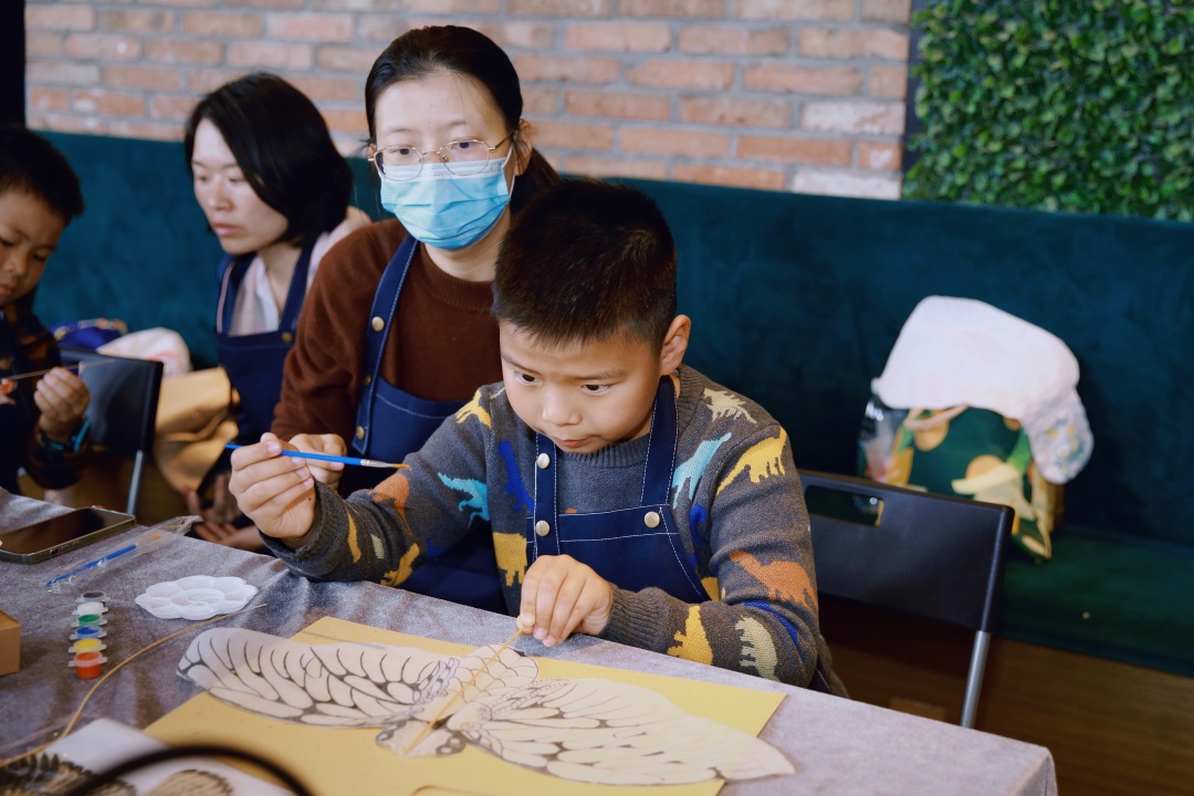 非遗传承讲师向大家详细介绍了风筝的起源、制作方法及技巧,并指导大小朋友们完成了主体框架的拼搭。看着一只只精巧可爱的纸鸢逐渐成型,小朋友们迫不及待地拿起颜料、画笔开始创作。蘸颜料、规划、涂抹……绚烂的色彩,是大家对天空和春天的美好想象。