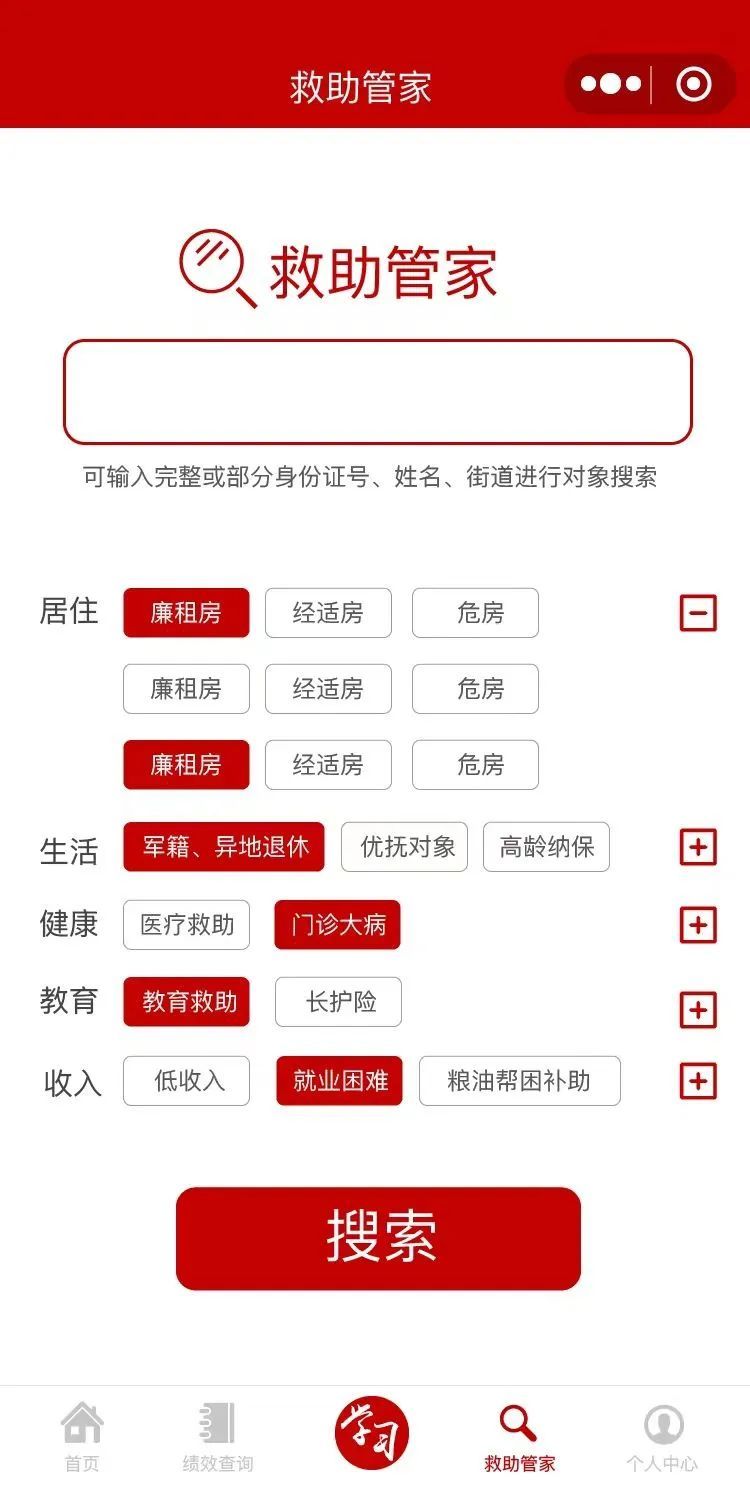 “福民救助管家”旨在进一步提高管理服务水平和救助执行力度,在原有困难群众电子档案基础上建成,从包含家庭、生活、健康、住房、就业几个维度考虑,以社会救助对象为主体,辐射未纳入救助体系的边缘困难群体,并将标签积分化,形成南西辖区内困难群众的“大帮扶”概念。