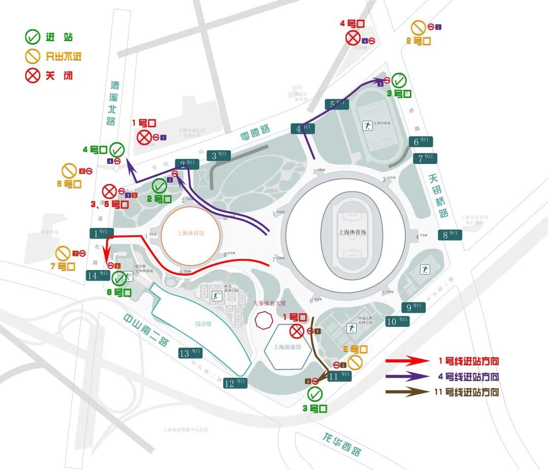 请至轨道交通11号线上海游泳馆站(中山南二路龙华西路口)乘车的球迷朋友们,从3号口进站,2号口限流只出不进,1号口关闭。