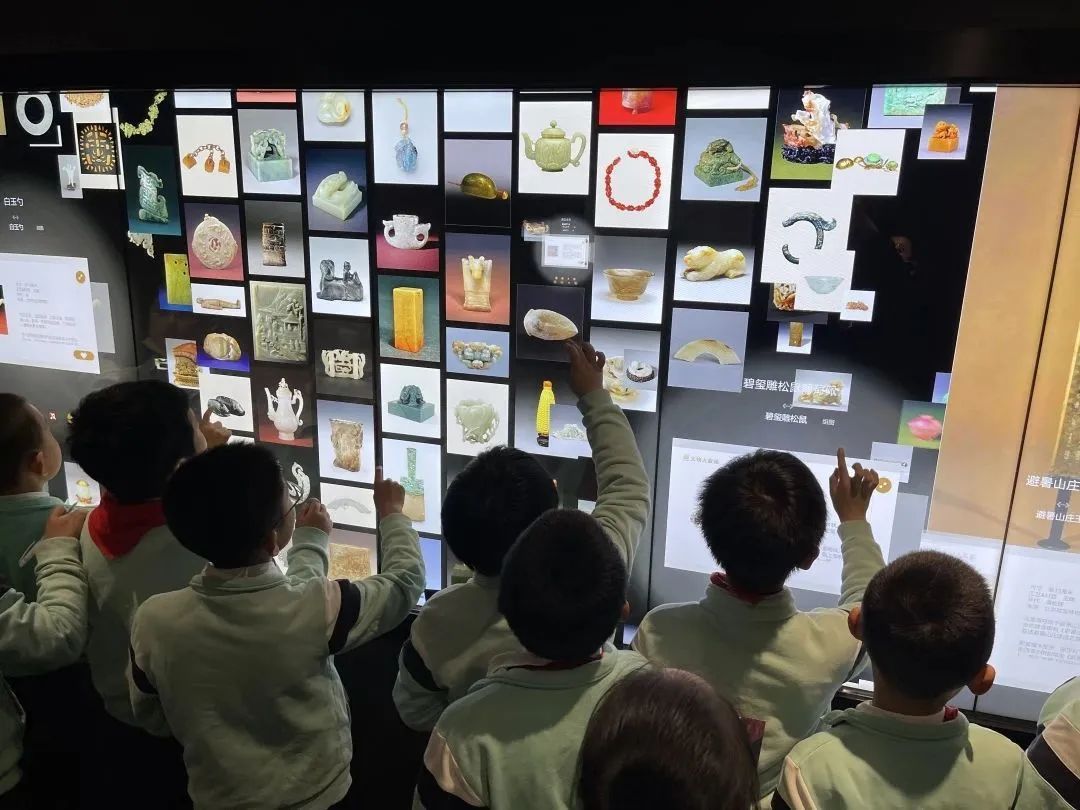 来自徐汇区西位实验小学的学生们走进位于漕河泾开发区内的九点水美术馆,课程的第一站是参观元宇宙设计创意大赛成果展。虹梅街道志愿讲解员正在为孩子们介绍展览的内容。这里有各大游戏公司以游戏为背景打造的VR虚拟世界,还有数字化文物保护,让文物活起来。
