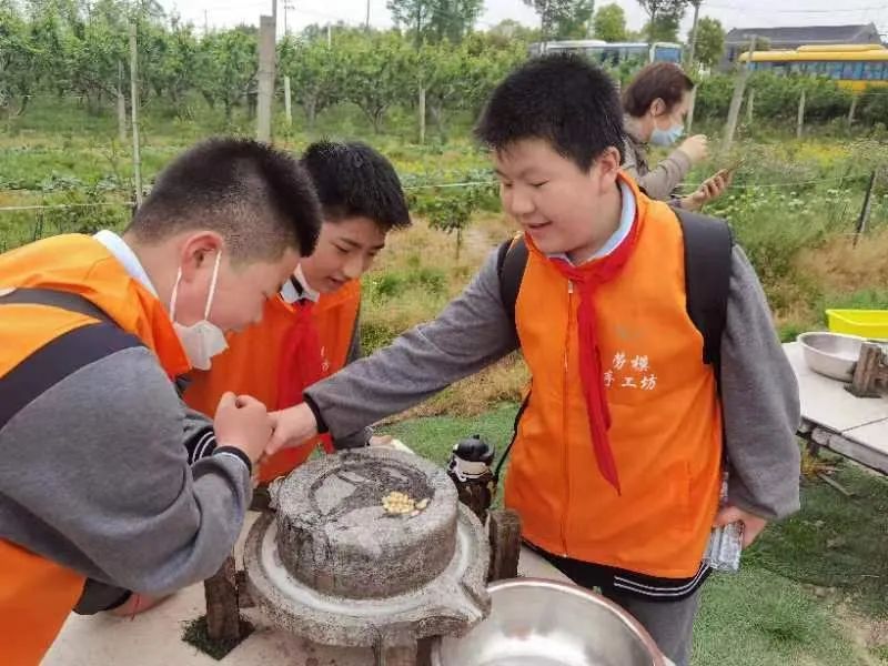 学生们穿上劳动马甲,走到田间地头,在劳模手把手调教下,学种当季蔬菜青菜,用石磨磨豆浆,听劳模介绍脆冠梨种植养护管理方法。