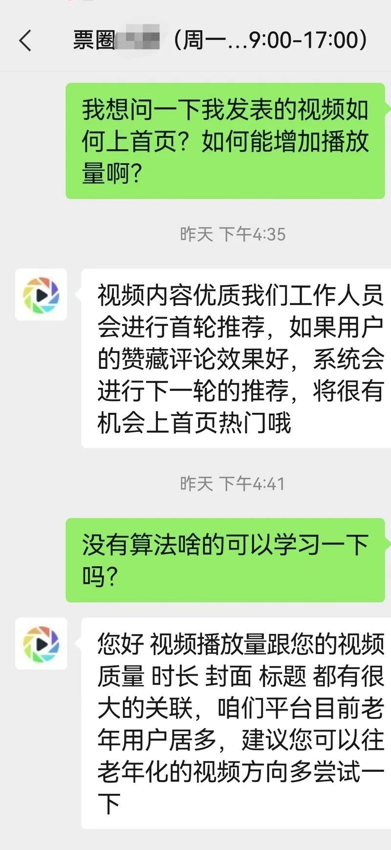 记者加了票圈客服微信,咨询什么样的内容会被推荐到首页,客服回复:“视频内容优质,工作人员会进行首轮推荐,如果用户的赞藏评论效果好,系统会进行下一轮推荐,将很有机会上首页热门”。客服还提醒:“平台目前老年用户居多,建议往老年化的视频方向多尝试一下。”