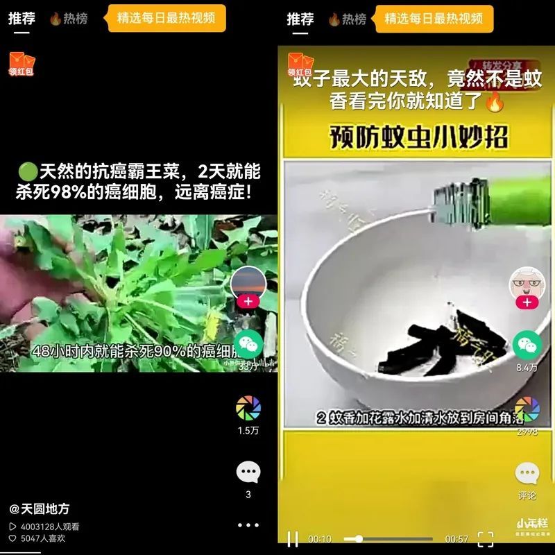 记者观看发现,这类小视频小程序不仅传播谣言和伪科学,还充斥着大量封建迷信和毒鸡汤,内容主要集中在老年人关心的健康养生、食品安全、国际局势、历史知识等领域。若老年人相信视频内容,可能带来财产损失和人身伤害。比如,不少视频所称的“民间偏方”并不能防病治病,还有些所谓的“生活诀窍”风险不小,比如鼓动观看者自己用化学材料自制电蚊香液等。