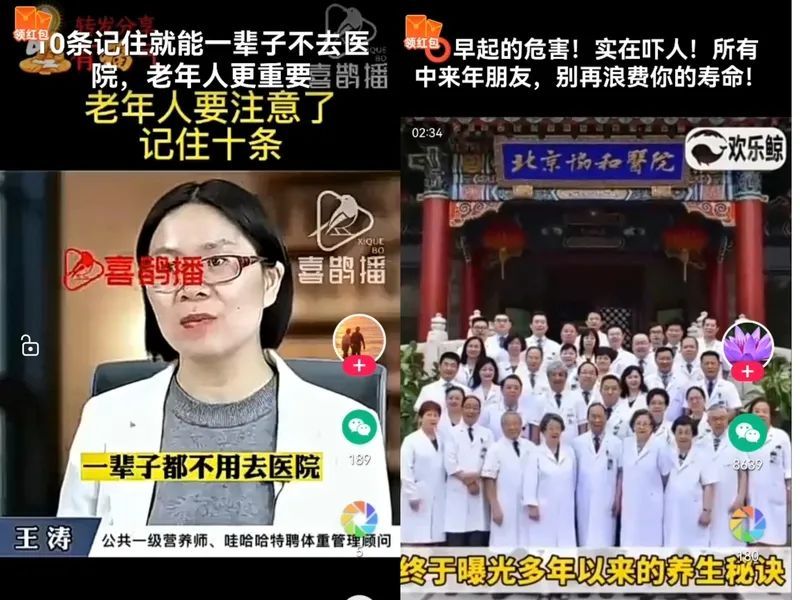 四、健康养生、生活妙招等内容用户喜闻乐见,但其中充斥着大量伪科学。最典型的标题就是:“吃xx食物会致癌/防癌/抗癌”“做xx动作可以预防疾病/治疗疾病/导致生病/不导致生病”“为了家人的健康,一定要/不要这么做”等。实际上,疾病是多种因素共同作用的结果,谣言视频中把疾病归因于单一因素,是把复杂的问题简单化。网传诸多预防疾病、抗癌防癌的民间偏方,很多都没有科学依据。这类视频制作者正是抓住了老年人对疾病的恐惧心理,制作出大量伪科学视频,大肆传播。