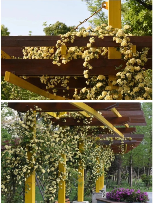 市绿化市容局介绍,申城的四月除了“C位”木绣球外,月季初绽,木香盛开,其黄色的如砌金,白色的如堆雪,花开繁复,碎玉飞瀑,铺叠满架,蔚为壮观,恰似缤纷的花海瀑布。一起来赏↓