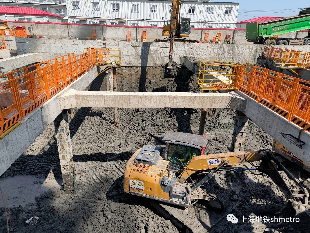 为加快基坑开挖进度、缩短基坑暴露时间,现场配备两台长臂挖机,两台小挖机,一台85吨履带吊协同工作。截至4月15日,浦东足球场站主体基坑已按施工计划顺利完成第一层土方开挖,完成60根钢支撑,完成7天一层的节点目标。下一步,项目管理分公司将严格按照“分层开挖,严禁超挖,先支撑,后开挖”的原则,保障深基坑土方开挖顺利完成。