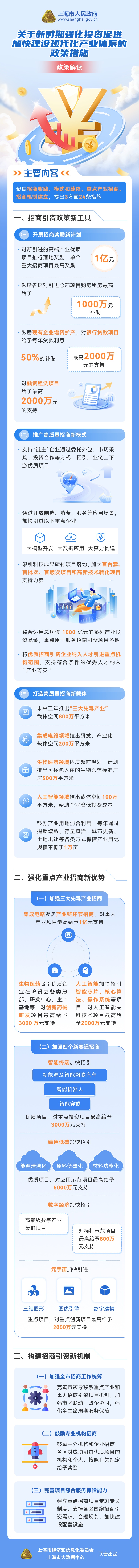 为进一步强化投资促进工作,吸引更多优质企业来沪投资,加快建设现代化产业体系。近日,上海市人民政府办公厅印发了《关于新时期强化投资促进 加快建设现代化产业体系的政策措施》,共涉及24条投资促进新政策。新政将进一步提升本市投资促进工作能级和水平,提振市场主体投资信心。