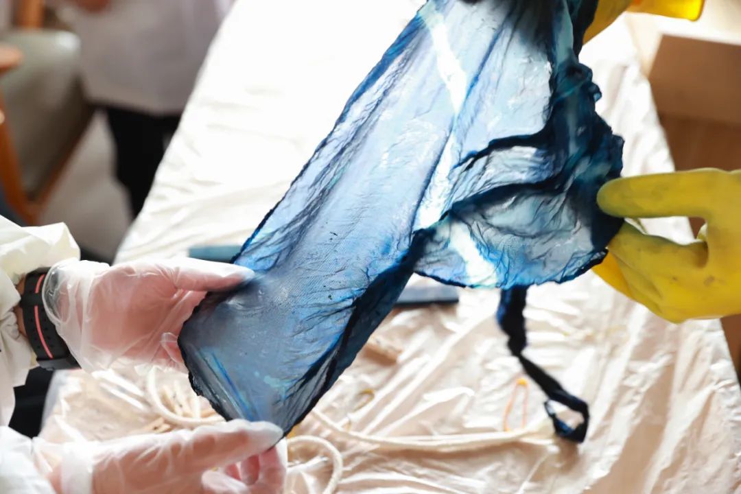活动现场,指导老师示范了扎染的多种技法,随后小朋友们以饱满的热情投入到创作中。大家根据自己对扎染的理解,充分利用棉白布的吸水性和色彩的渗透性进行创作。在父母和老师的帮助下,小朋友们完成第一步创作后,将半成品放入染料池浸泡,待片刻后取出,经空气氧化,再清洗干净,便收获了风格不同、色彩各异的作品。“时间越长染得越深,不仅可以染在方巾上,还可以做成扎染帽子、围巾、挎包等。”指导老师说,做扎染就像拆盲盒一样,因为不知道会染成什么样,几乎每一次都会有出乎意料的美。