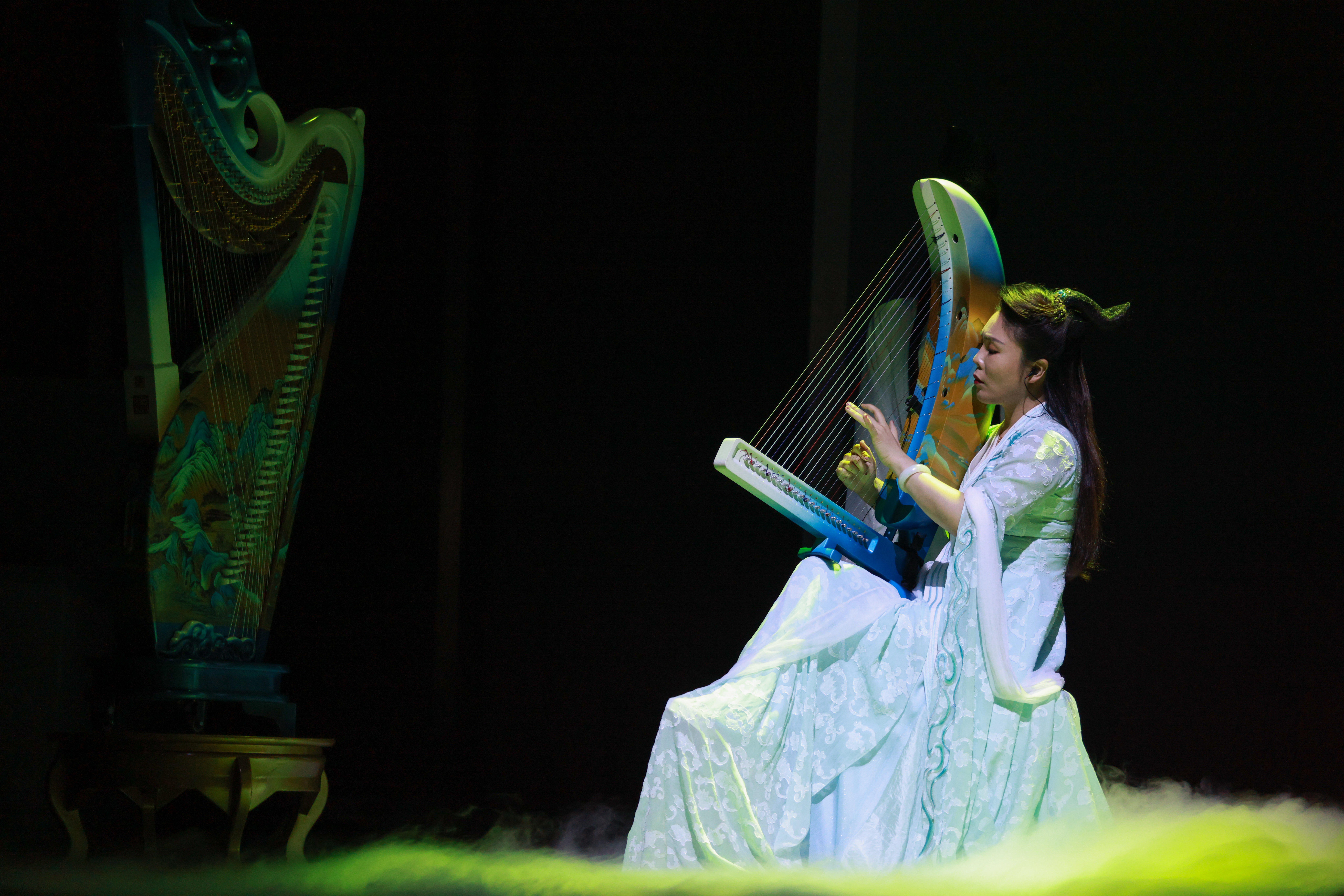 音乐诗画《江山竞秀》以十二幅壮丽图景展现传世名画《千里江山图》中的地理景观和人文风情,通过融合箜篌、琵琶、竹笛、古琴等民族乐器和西洋铜管乐,和绘画、书法等表现方式,展现祖国青山绿水的视听画卷。