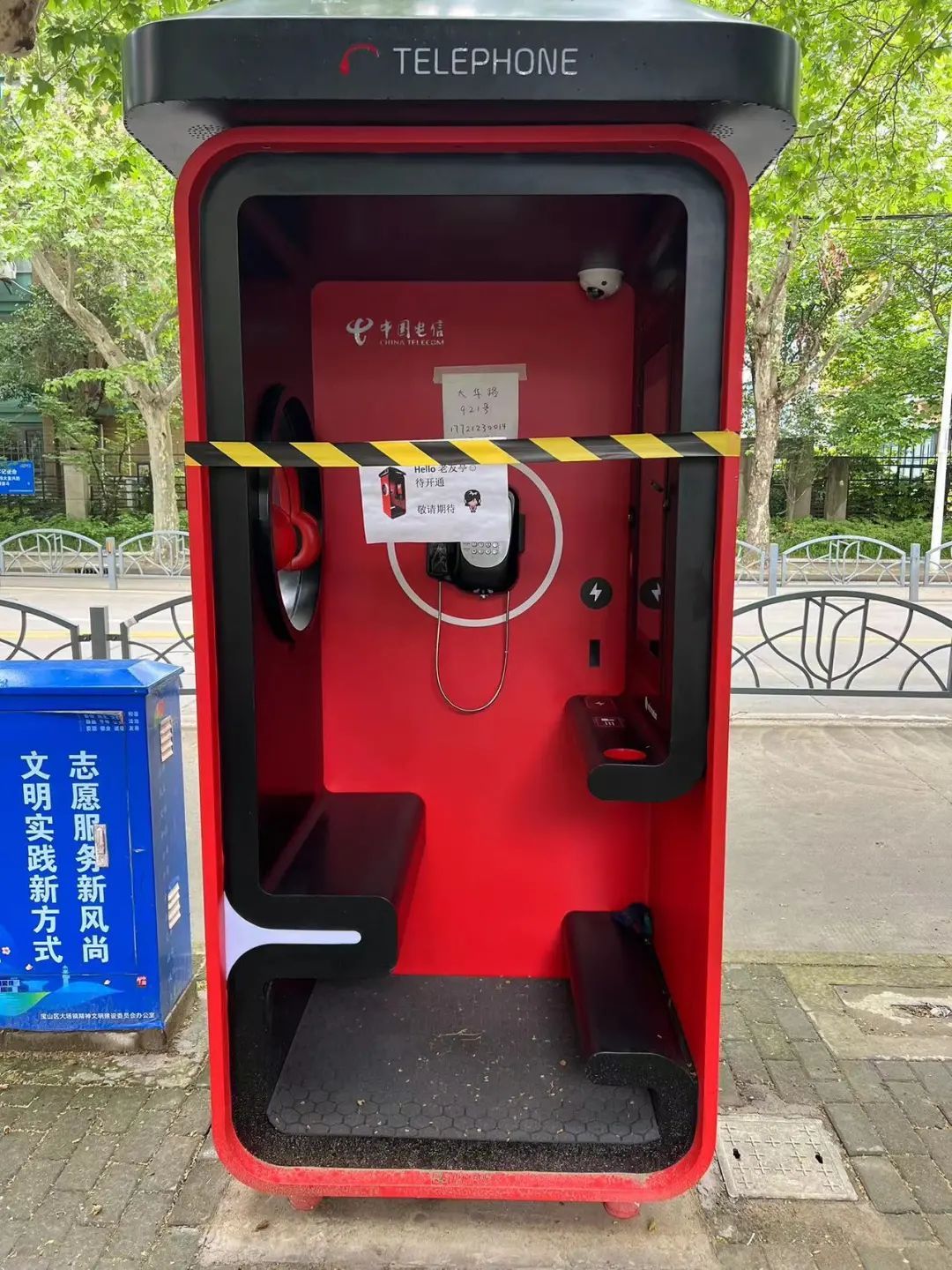 近日,宝山区大场镇大华路921号发现一个“红衣”电话亭。据中国电信上海北区电信局大华支局负责人介绍,该电话亭是大场镇首个“Hello老友亭”,将于五月中旬完成内部线路开通,正式投入使用。