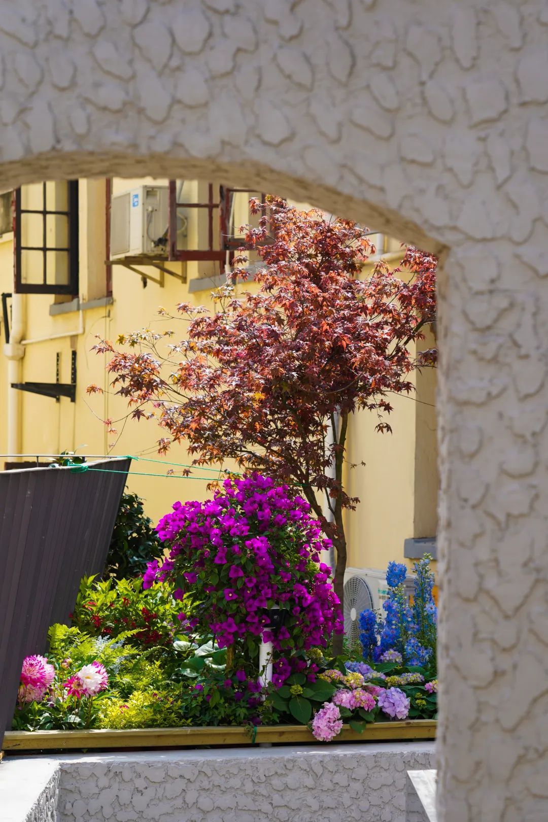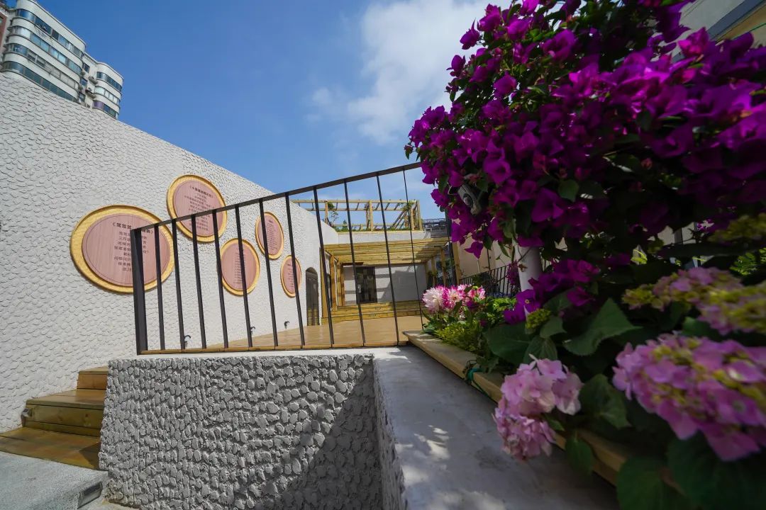 再走几格木质台阶,就是视野最开阔也最难得的顶楼花园了。眼前是自然与艺术气息相融的藤蔓花架、户外台阶,楼下是百年弄堂的市声与烟火,远处有居民或晾晒或侍弄花草的身影,隔壁是嘉善老市多元文化融合的时尚,这个“屋里厢”空间还能装进多少花样,变出多少魔法?且拭目以待!