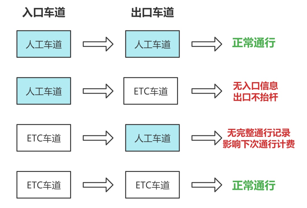 出入高速的车道类型应该保持一致。即入高速公路的车道选择为人工车道,出高速公路的车道也需选择为人工车道;入高速公路的车道选择为ETC车道,出高速公路的车道也需选择ETC车道,方可享受便捷免费通行。