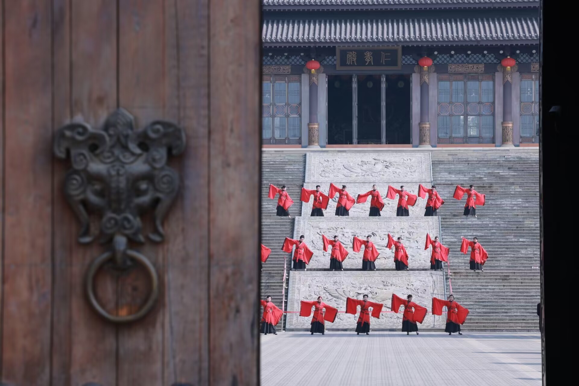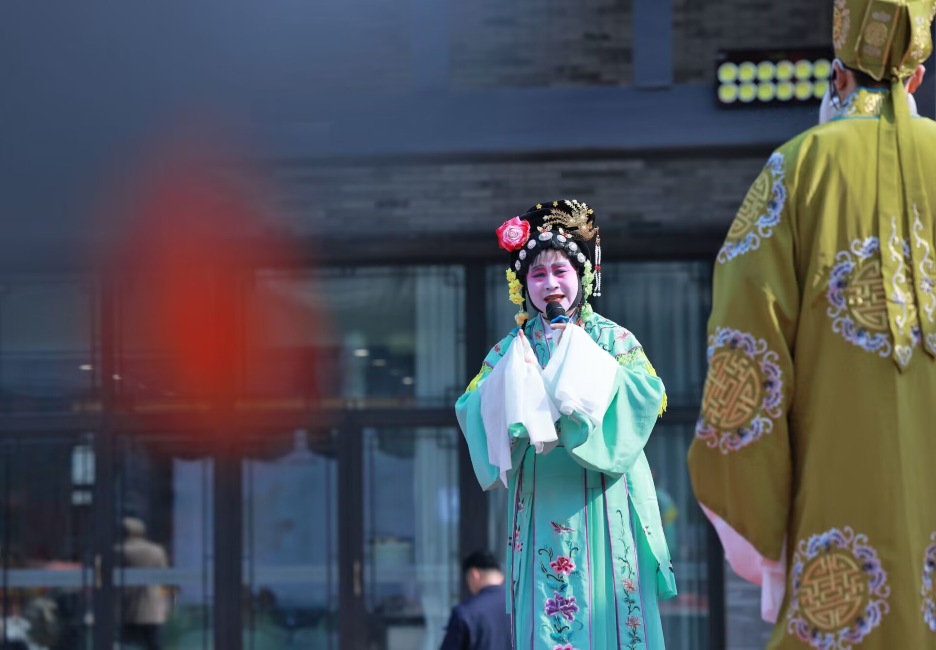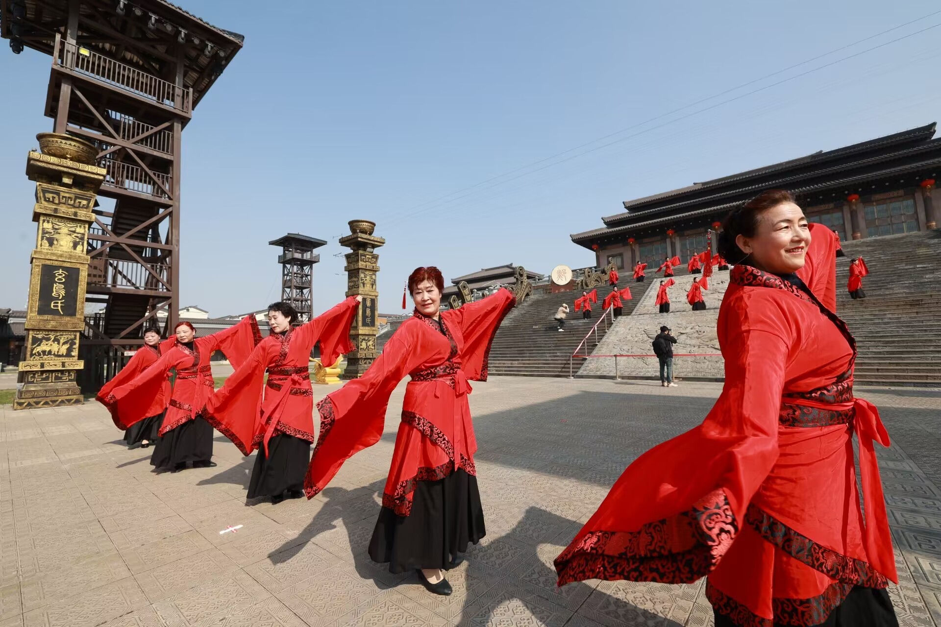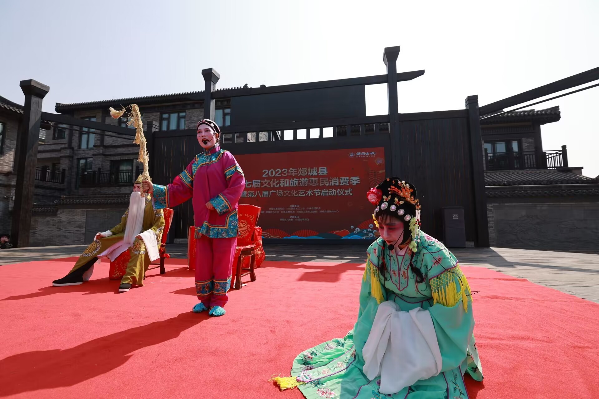 4月26日,临沂市郯城县郯国古城风景区,汉服爱好者表演汉服秀,与典雅古城相映成趣。传统戏曲表演,同时为古城增添一道文化风景。
