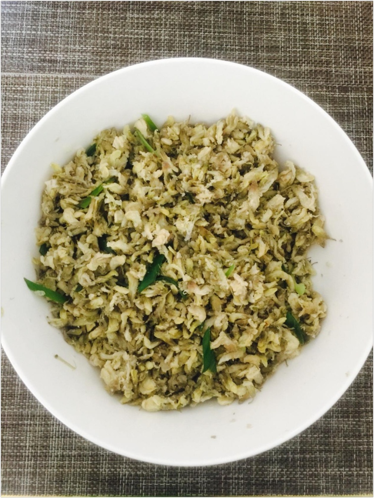 制作步骤:将槐花洗净,沥干水分,拌入面粉和盐,放入蒸笼蒸20分钟。蒸好后拌上熟油和葱花等调料。