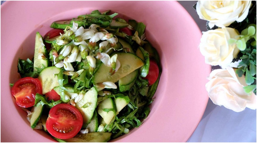5、撒上芝麻和香菜,即可出锅享用。越南的槐花沙拉的做法如下: