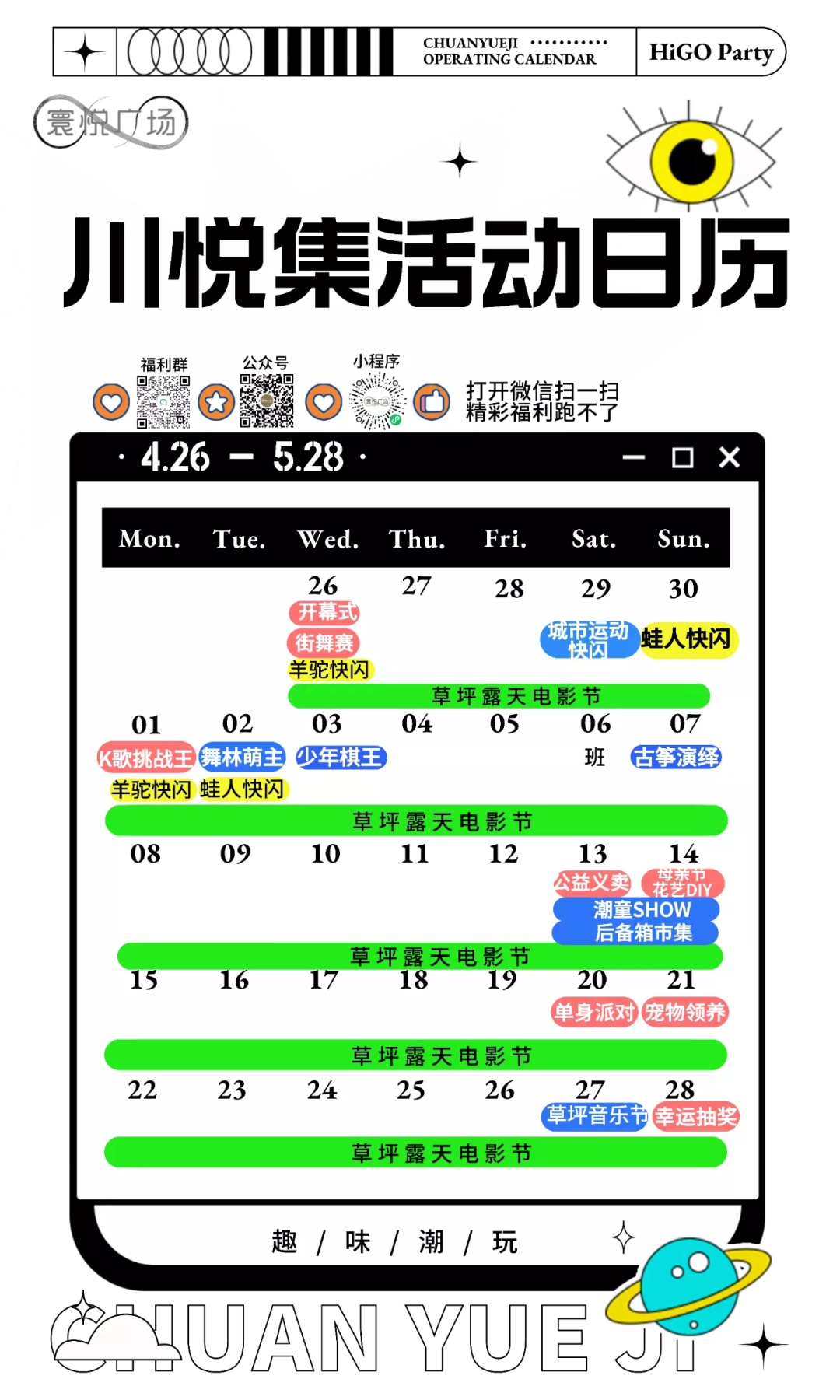 4月26日—5月28日,每周五、六、日及五一小长假期间,18-21点寰悦广场将搭建草坪帐篷,供大家打卡互动,免费观影。